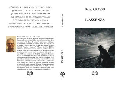 Titolo/L'Assenza/autore/Bruno Grasso/dim.15x21/carta/85gr.avorio/stampa/Brossura fresata b.n/ pag.133/copertina 300gr. plastificata lucida/ stato/in pubblicazione disponibile in prevendita/Euro 18,00